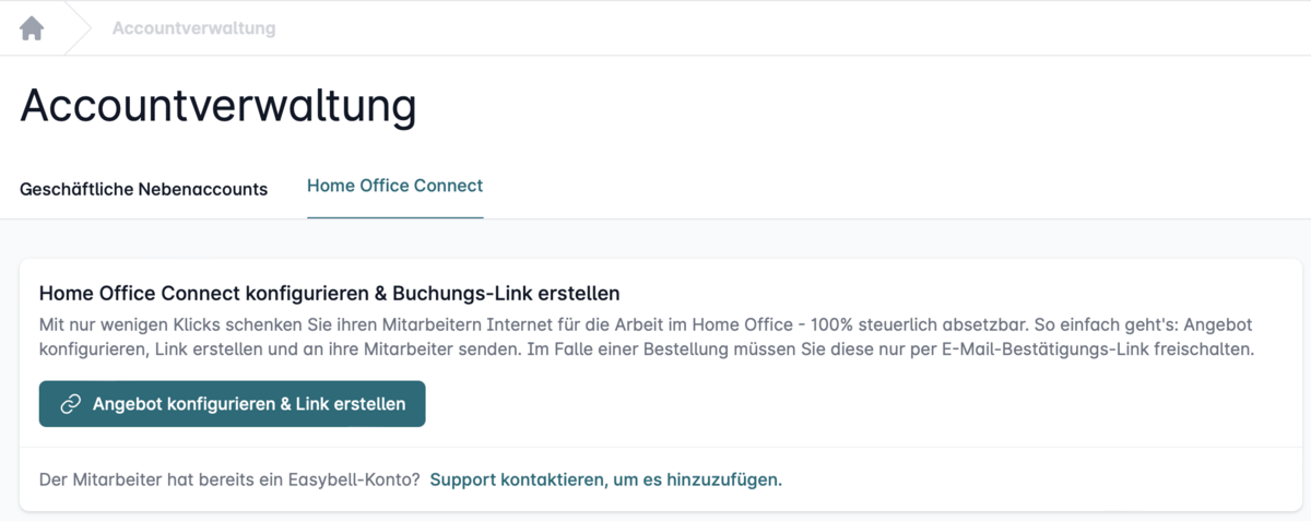 Wer noch keinen Internet- oder VoIP-Anschluss bei Easybell hat oder erstmal nicht haben möchte, kann den kostenlosen Tarif „Home Office Connect Hub“ buchen. Über diesen Basis-Account werden dann die Mitarbeiteranschlüsse abgerechnet, es entstehen aber keinerlei weitere Kosten.