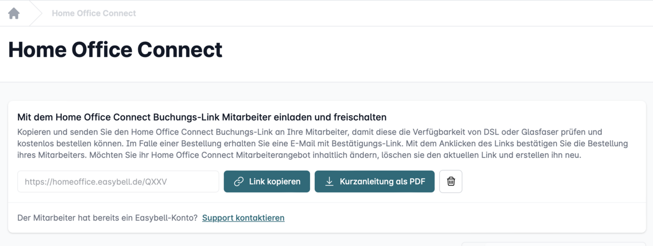Sollten Sie Home Office Connect bereits eingerichtet haben, finden Sie hier den Link zur Bestellung neuer Anschlüsse und eine Übersicht der bestehenden Anschlüsse.