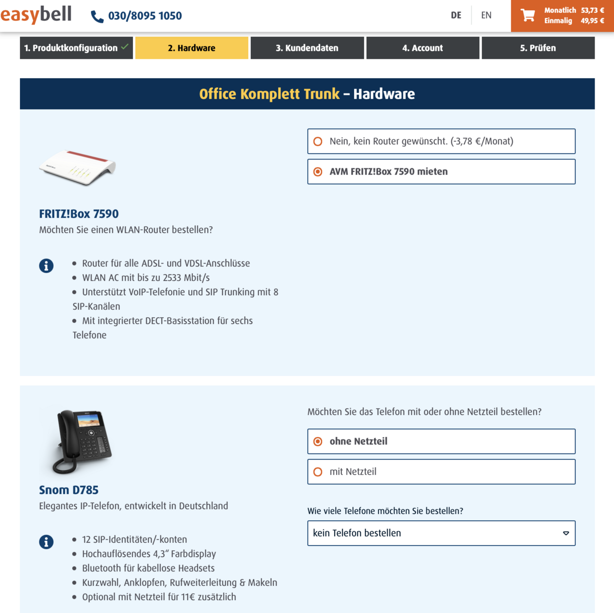 Im nächsten Schritt können Sie unter anderem einen vorkonfigurierten Router gleich mitbestellen. Nach der Schaltung müssen Sie diesen nur noch anstecken und es kann losgehen - Eine manuelle Eingabe der Einwahldaten entfällt. Das Angebot kann abhängig vom Tarif und der Verfügbarkeit unterschiedlich ausfallen. Bei Unternehmenstarifen können Sie beispielsweise zusätzlich IP-Telefone bestellen.