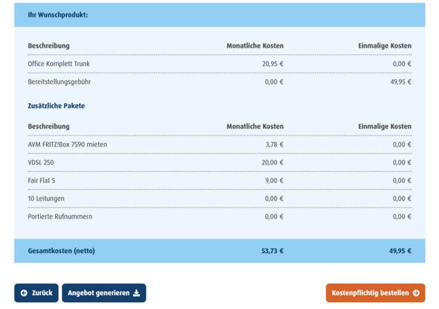 Der besondere Clou: Wenn Sie die Bestellung noch nicht abschließen wollen, können Sie sich ihre Konfiguration als Angebot herunterladen. In diesem PDF-Dokument finden Sie dann auch einen Link, mit der Sie die Bestellung später fortsetzen können.