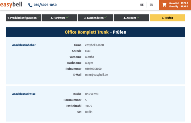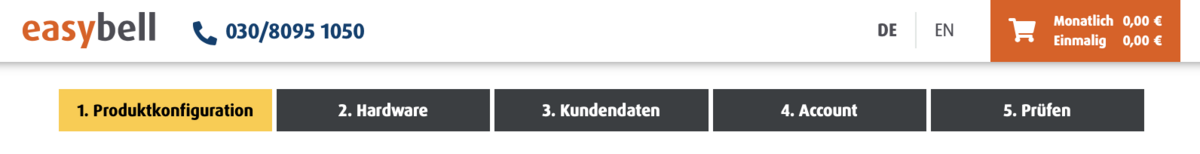 Der Bestellprozess von easybell führt Sie in fünf einfachen Schritten zu Ihrem individuellen Wunschtarif.