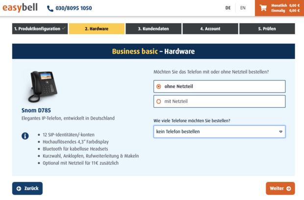 Bei Unternehmenstarifen können Sie im nächsten Schritt gleich passende IP-Telefone bestellen. Das Angebot kann abhängig vom Tarif und der Verfügbarkeit unterschiedlich ausfallen.