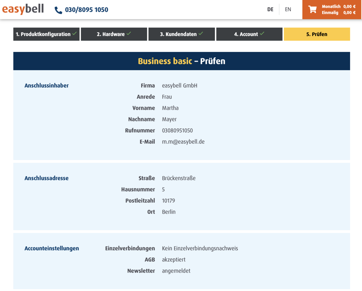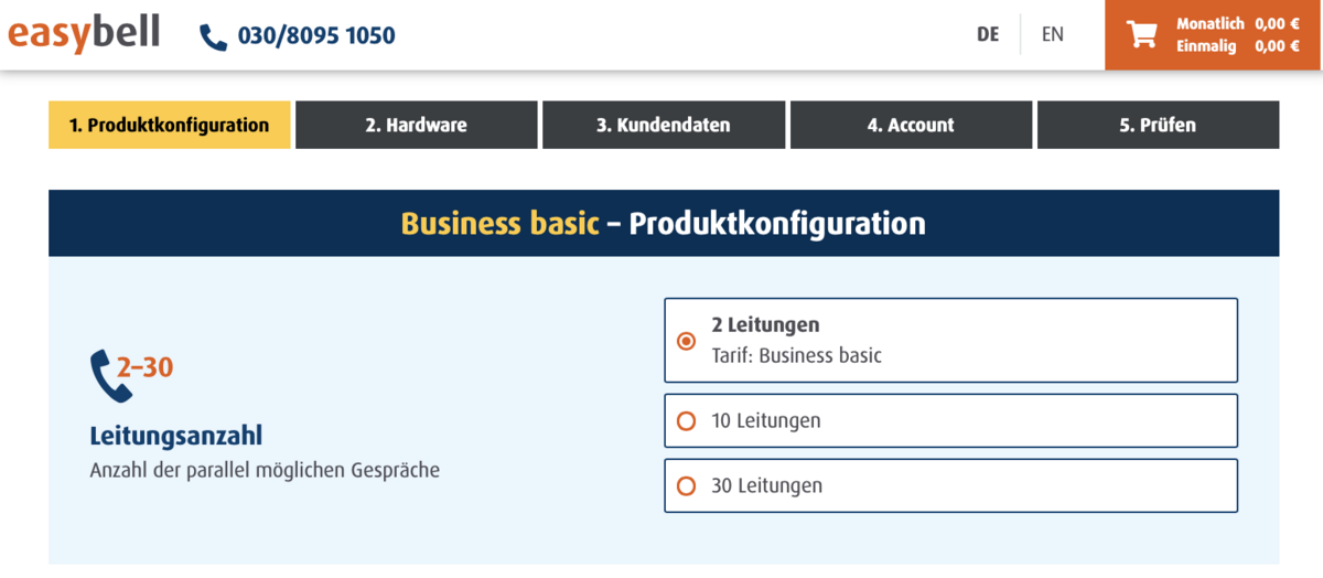 Der Bestellprozess von easybell führt Sie in fünf einfachen Schritten zu Ihrem individuellen Wunschtarif.