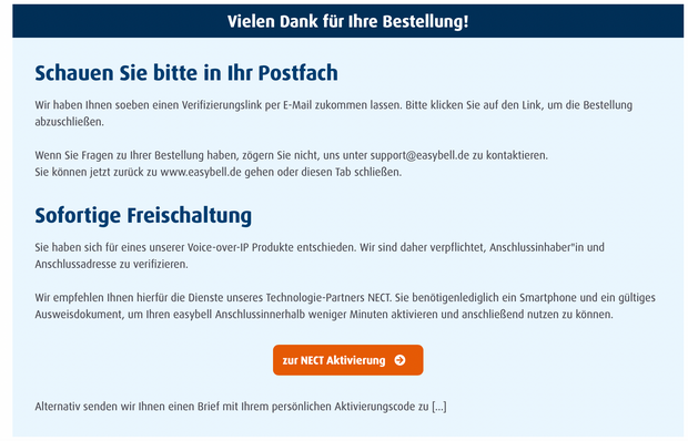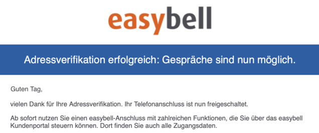 Wenn die Überprüfung durch Nect erfolgreich war, wird Ihnen das von easybell noch einmal bestätigt: „Freischaltung erfolgreich“.