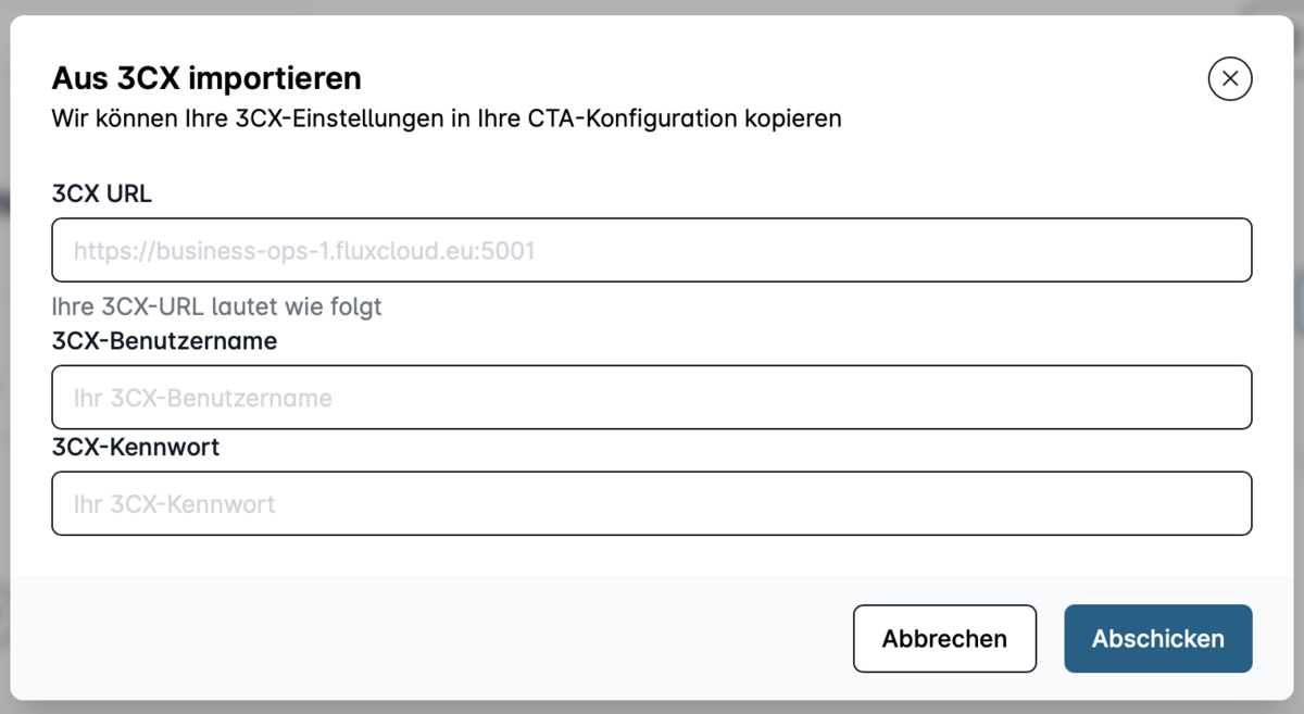 Im Fenster „Aus 3CX importieren“ füllen Sie bitte folgende Felder aus und bestätigen Sie Ihre Eingaben mit dann mit „Abschicken“.