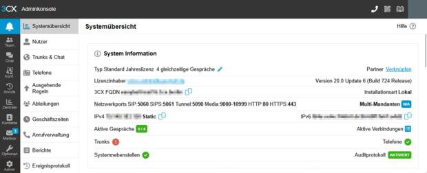Navigieren Sie zum Bereich „Admin“ → „Systemübersicht“. Unter „System Informationen“ finden Sie Ihre 3CX-FQDN. Diese benötigen Sie später für den Import. Kopieren Sie sie am besten direkt.