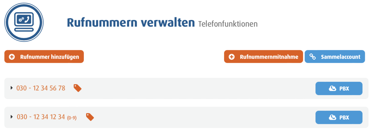 In der Übersicht können Sie nun sehen, dass die ausgewählte Rufnummer ebenfalls im PBX-Modus ist.