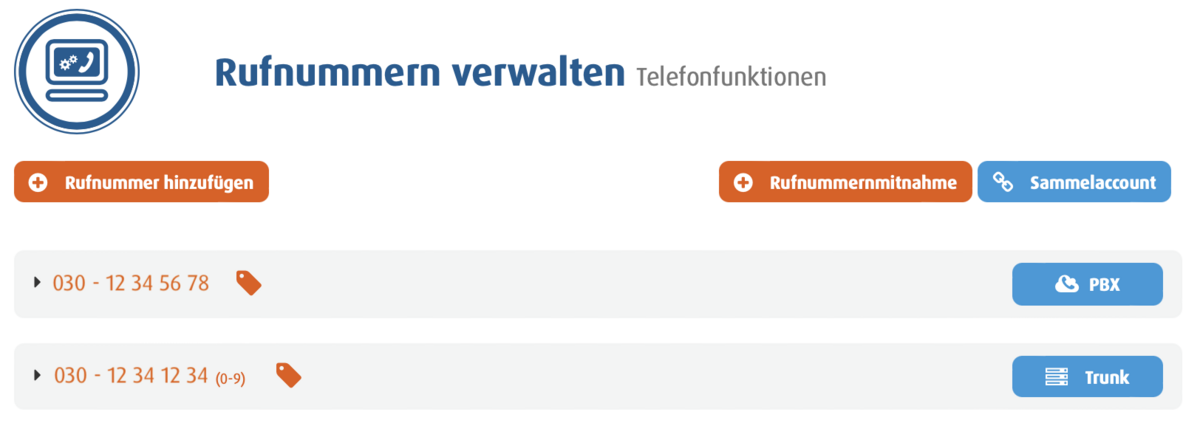 In unserem Beispiel-Screenshot können Sie sehen, dass eine der Rufnummern bereits in die Cloud Telefonanlage übertragen wurde („PBX“ im blauen Button). Die zweite angezeigte Nummer ist noch nicht in der Cloud Telefonanlage verfügbar („Trunk“ im blauen Button).