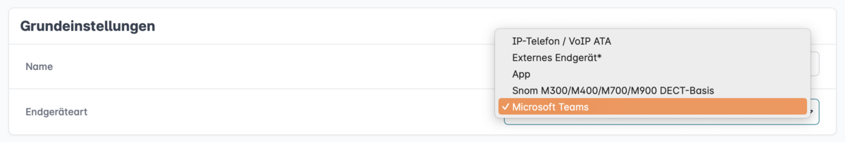 Klicken Sie dazu im Bereich „Endgeräte“ auf „Hinzufügen“ und wählen dann als Endgerätetyp „Microsoft Teams“.