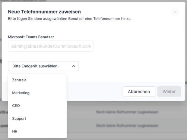Indem Sie auf das Plus-Zeichen neben einem Benutzer klicken, können Sie aus den zuvor angelegten Endgerätekonten wählen (Schritt 1.2.). Alternativ können Sie auch die Rufnummer ändern oder vollständig entziehen.