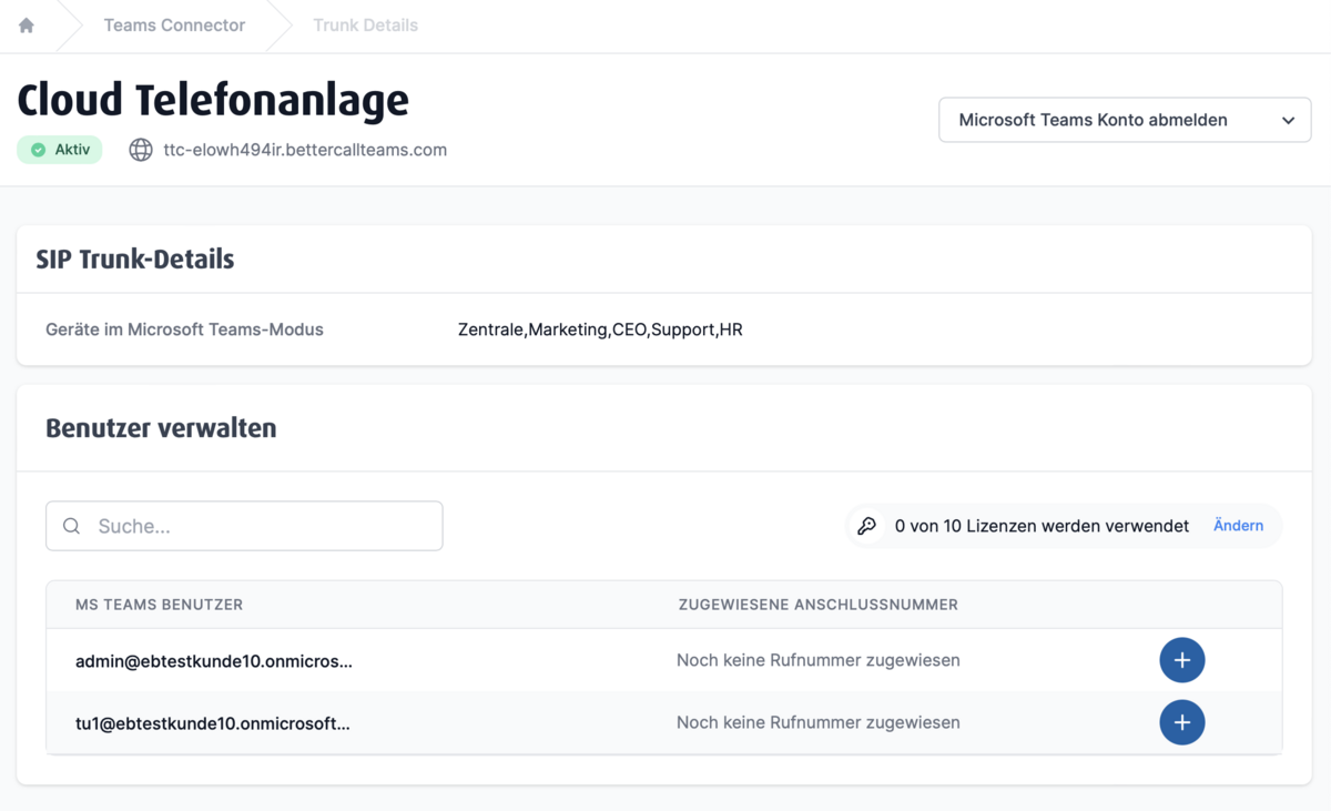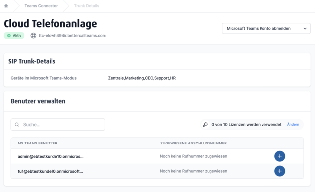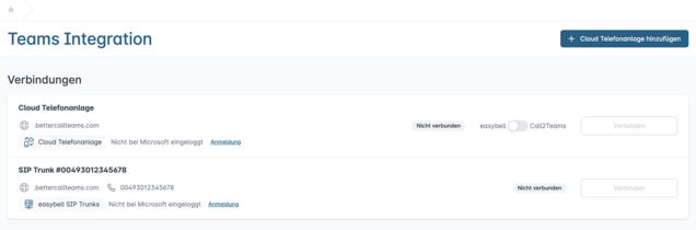 Auf der Übersichtsseite des Teams Connectors werden zunächst lediglich easybell-Rufnummern angezeigt, die sich im Trunk-Modus befinden. Wenn keine Rufnummer im Trunk-Modus ist, kann es also sein, dass die Übersicht zu Beginn leer ist.