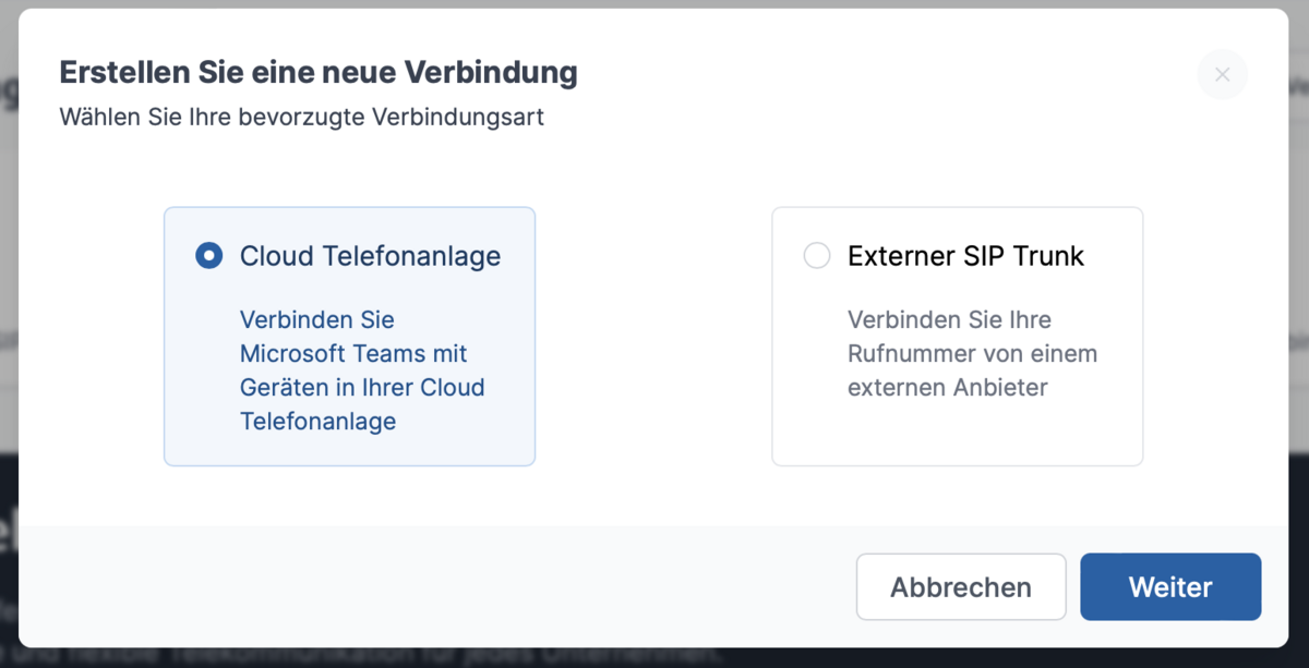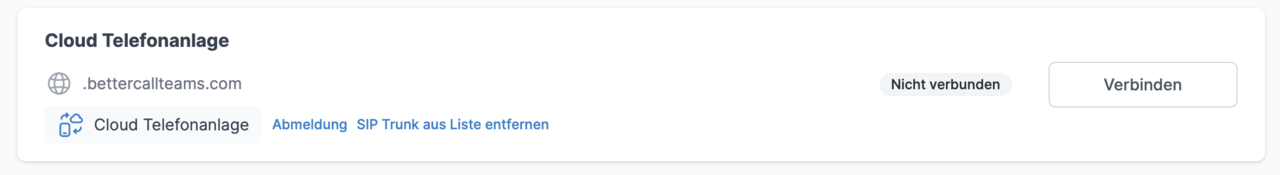 Klicken Sie bitte auf „Verbindung hinzufügen“ und wählen dann „Cloud Telefonanlage“ aus. Der entsprechende Eintrag wird daraufhin in der Liste der Verbindungen angezeigt.