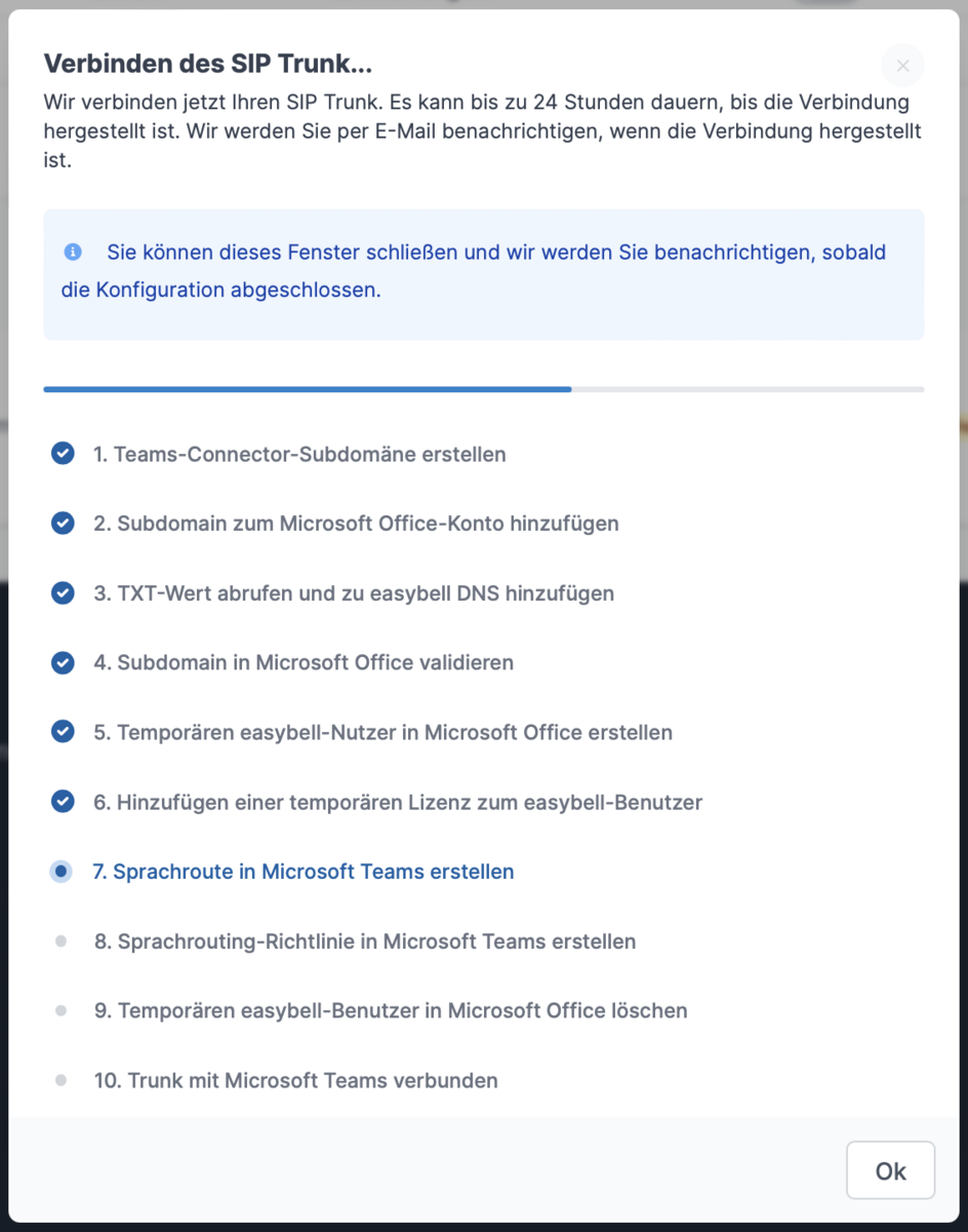 Einen detaillierten Überblick der Einrichtungsschritte erhalten Sie, indem Sie auf „Status anzeigen“ klicken. Sobald Schritt 10 von 10 abgeschlossen ist, ist die Cloud Telefonanlage mit Microsoft Teams verbunden.