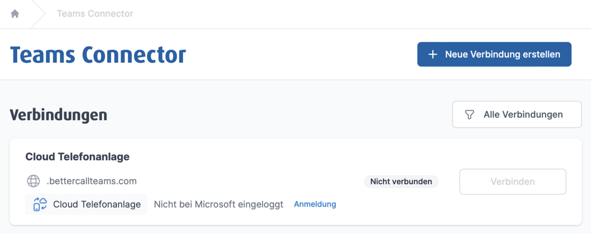 Der Verbindungsstatus bezieht sich lediglich auf die Verbindung zwischen Ihrer Cloud Telefonanlage und Ihrer Microsoft-Teams-Instanz. Infolgedessen werden alle Endgerätekonten mit dem Typ „Microsoft Teams“ immer identisch dargestellt.