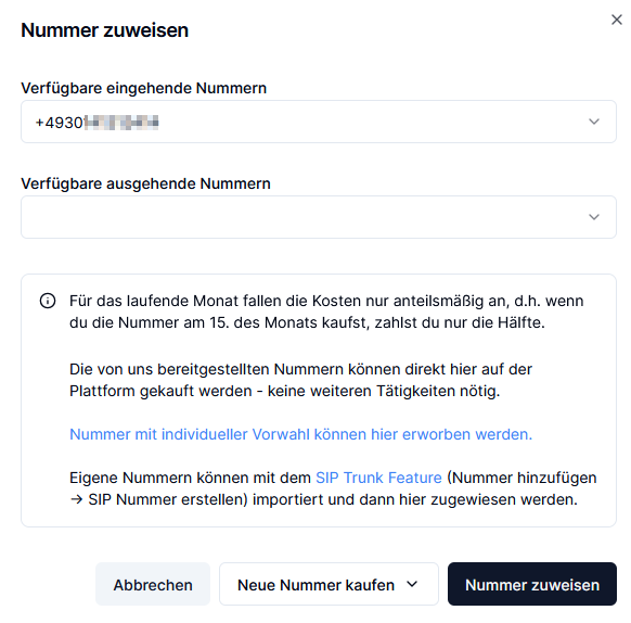 In der Bearbeitungsmaske des Assistenten gibt es oben rechts einen Button „Telefonnummern“, über den Sie Ihre Telefonnummer diesem Assistenten zuweisen können.