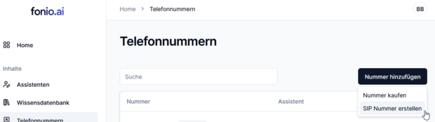 Gehen Sie zu „Telefonnummern“ und klicken Sie auf „Nummer hinzufügen“ → „SIP Nummer erstellen“.