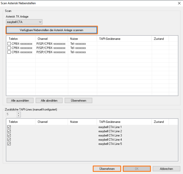 Sie werden wieder in das Fenster „Konfiguration“ geleitet. Klicken Sie nun bitte unten rechts auf den Button „Scan…“, um das Fenster „Scan Asterisk Nebenstellen“ aufzurufen.