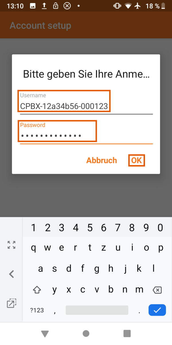 Username: SIP-Benutzername aus dem Kundenportal, hier als Beispiel „CPBX-12a34b56-000123“