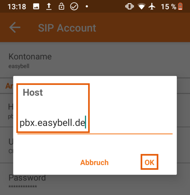 Hier ändern Sie bitte den Host auf „pbx.easybell.de“ und bestätigen Sie mit „OK“.