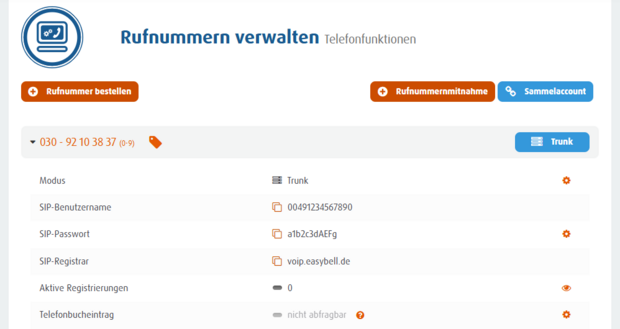 SIP-Zugangsdaten: Im Kundenportal unter „Rufnummern verwalten" in der Detailansicht der jeweiligen Rufnummern.