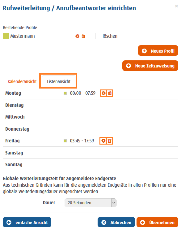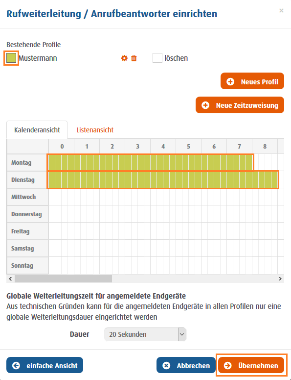 In der Übersicht der erweiterten Rufweiterleitung können Sie nun festlegen, wann Ihre Profile genutzt werden sollen.