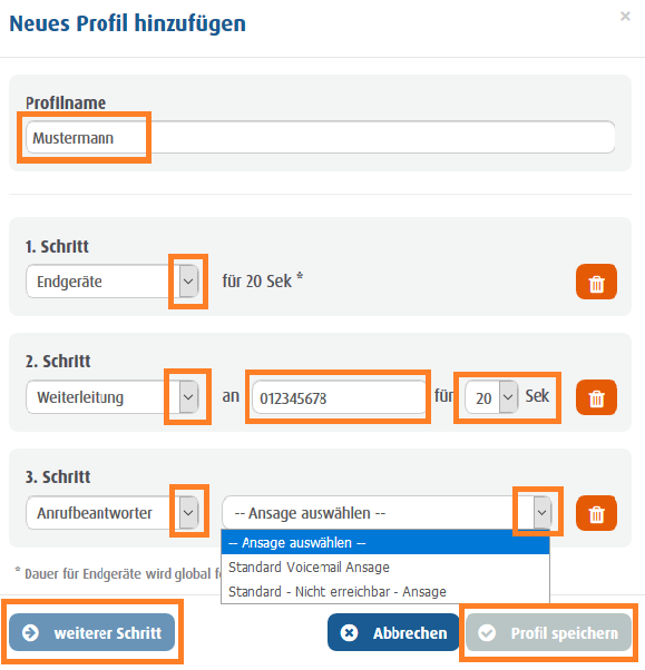 Anschließend können Sie die Schritte festlegen, wie und nach welcher Zeit der Anruf weitergeleitet werden soll.