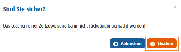 Sie werden nun gefragt, ob Sie sich sicher sind, da das Löschen der Zeitzuweisung nicht rückgängig gemacht werden kann. (Sie können die Zeitzuweisung aber erneut anlegen, falls gewünscht). Klicken Sie also auf „Löschen“.