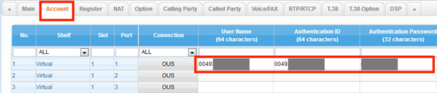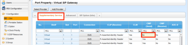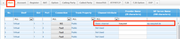 Falls mehrere SIP-Trunks verschiedener Provider genutzt werden, empfiehlt es sich ein eigenes Gateway für easybell zu verwenden. Gehen sie hierfür in der Panasonic Weboberfläche in die Einstellungen "1.1 Slots" unter "TK-Anlagenkonfiguration" und rufen Sie für die virtuelle Gateway-Karte V-SIPGW16 die Port-Einstellungen auf, wie in der folgenden Abbildung gezeigt.