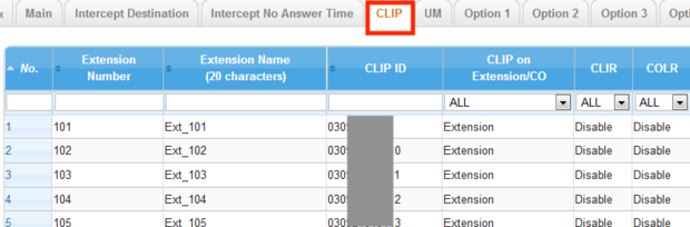 Gehen Sie in der Panasonic Weboberfläche zu den "Nebenstelle" Einstellungen unter 4.1.1 und öffnen Sie den Reiter "CLIP". Tragen Sie je Nebenstelle die gewünschte "CLIP ID" im notwendigen Format ein. Berücksichtigen Sie die unter 2.1 unter "Calling Party" getroffenen Eingaben zum Rufnummernformat.