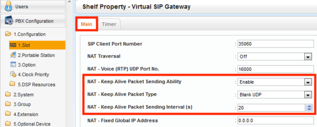 Sofern die Keep-Alive Nachricht von easybell (z. B. OPTIONS / BLANK-UDP-Pakete) nicht dazu dient, die Portweiterleitung für einen externen Router beizubehalten, aktivieren Sie BLANK UDP als Keep Alive-Nachricht wie in der folgenden Abbildung dargestellt. "NAT - Keep Alive Packet Sending Interval" sollte kürzer sein als die Ablaufzeit der Port-Weiterleitung des Routers.