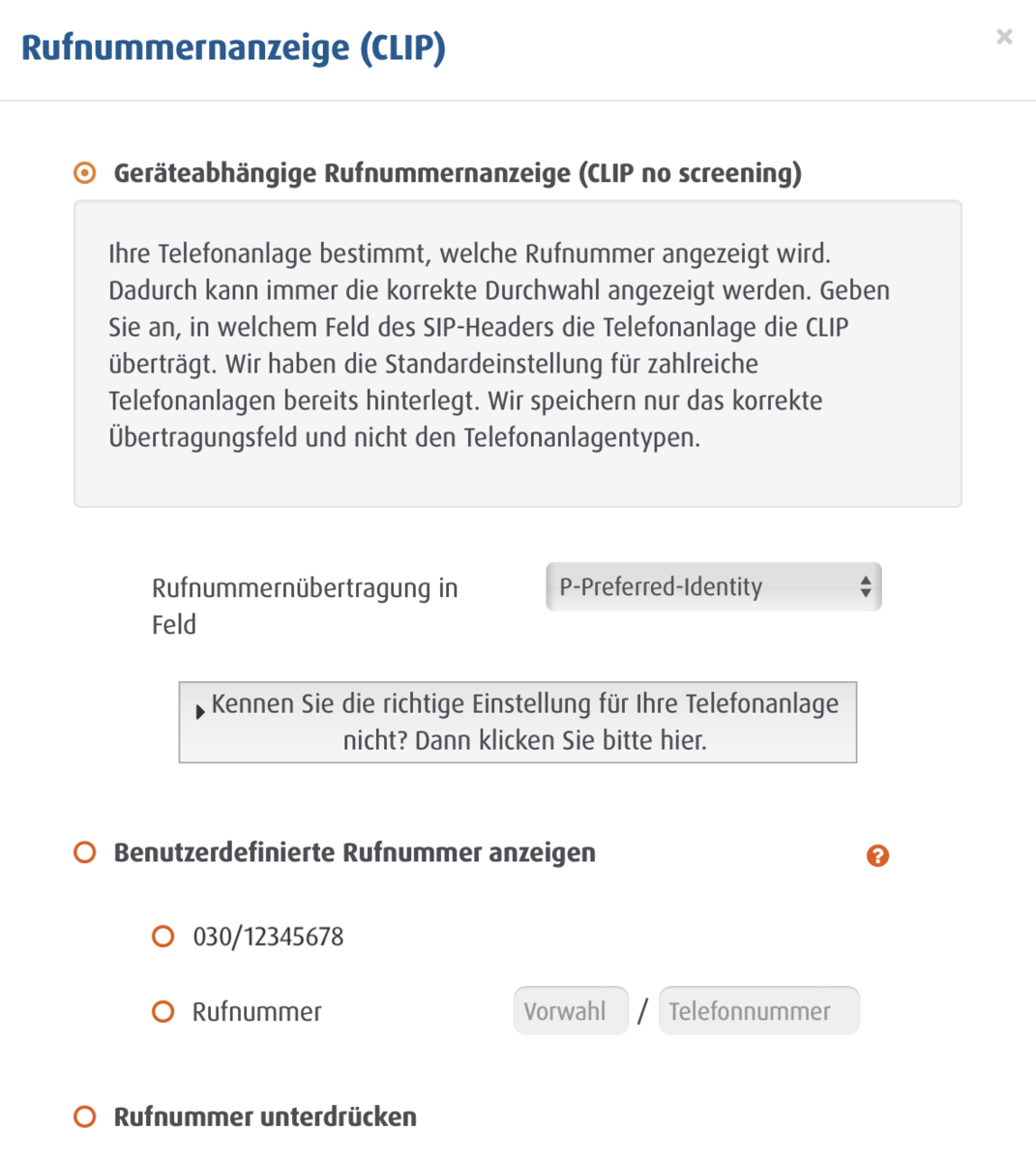 Öffnen Sie bitte in der Rufnummernverwaltung den gewünschten Rufnummernblock und gehen in den Punkt „Rufnummernanzeige (CLIP)“. In dem Menü muss nun die Option „Geräteabhängige Rufnummernanzeige (CLIP)“ aktiviert werden.
