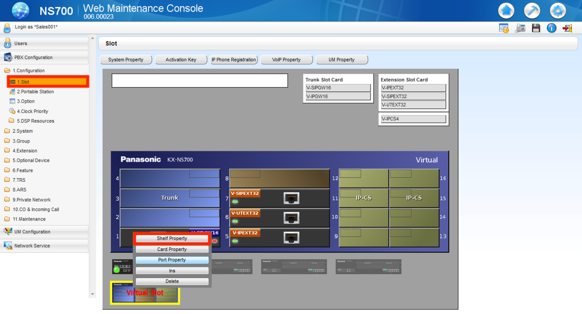 Falls Sie nicht mit dem nächsten Absatz fortfahren sollten, gehen Sie wieder in "1.1 Slots". Bewegen Sie den Mauszeiger über die Gateway-Karte "V-SIPGW16" und setzen Sie den Status der Karte zurück auf "INS" (in-service).