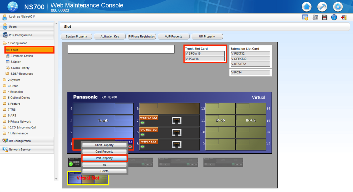 Falls mehrere SIP-Trunks verschiedener Provider genutzt werden, empfiehlt es sich ein eigenes Gateway für easybell zu verwenden. Gehen sie hierfür in der Panasonic Weboberfläche in die Einstellungen "1.1 Slots" unter "TK-Anlagenkonfiguration" und rufen Sie für die virtuelle Gateway-Karte V-SIPGW16 die Port-Einstellungen auf, wie in der folgenden Abbildung gezeigt.