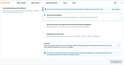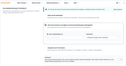 Im Abschnitt „Anrufweiterleitung & Parallelruf“ haben Sie die Wahl zwischen verschiedenen Rufweiterleitungen – bedingungslos oder nach Status des Trunks.