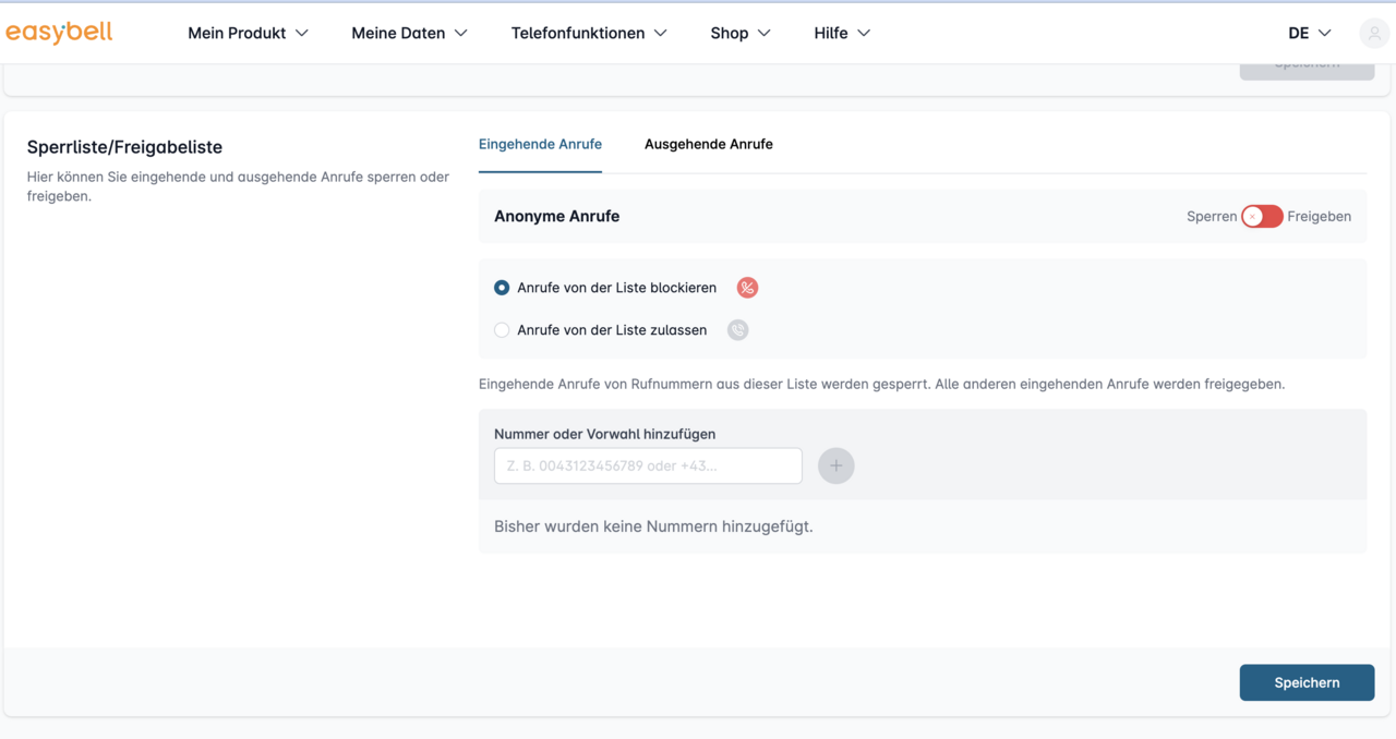 Im Abschnitt „Anrufweiterleitung & Parallelruf“ können Sie eingehende und ausgehende Anrufe blockieren, einschränken oder freischalten.
