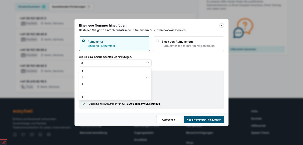 Hier wählen Sie aus, wie viele Telefonnummern Sie bestellen möchten. Um die neuen Nummern zu bestellen klicken Sie auf „Neue Nummer(n) hinzufügen“.