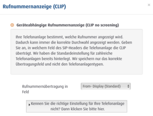 Achtung! Mit der geräteabhängigen Rufnummernanzeige ist es aus regulatorischen Gründen nur möglich, deutsche Orts- und Mobilfunkrufnummern sowie kostenlose deutsche Sonderrufnummern zu signalisieren. Mehr Informationen dazu finden Sie in unserem Artikel „Welche Rufnummern kann ich ausgehend anzeigen lassen?“.