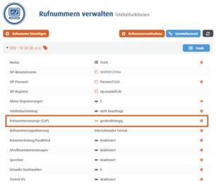 Bei Geschäftskundenanschlüssen können Sie Rufnummern/-blöcke im Modus „Trunk“ betreiben. In diesem Modus steht Ihnen zusätzlich die Option „Geräteabhängige Rufnummernanzeige (CLIP no screening)“ zur Verfügung.