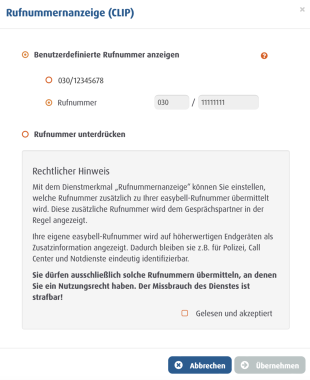 • Sie dürfen ausschließlich solche Rufnummern übermitteln, an denen Sie ein Nutzungsrecht haben.