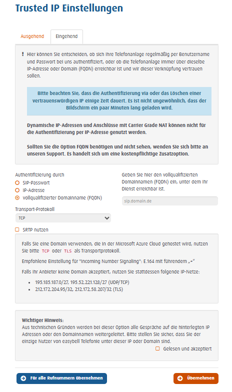 Wenn Sie Ihre Telefonanlage auf Basis der Microsoft Azure Cloud betreiben, setzen Sie am besten TCP oder TLS als Transportprotokoll ein. Bei der Einstellung „Incoming Number Signaling“ raten wir zudem dazu, das E.164-Format mit führendem Pluszeichen zu verwenden, beispielsweise +49301234567.