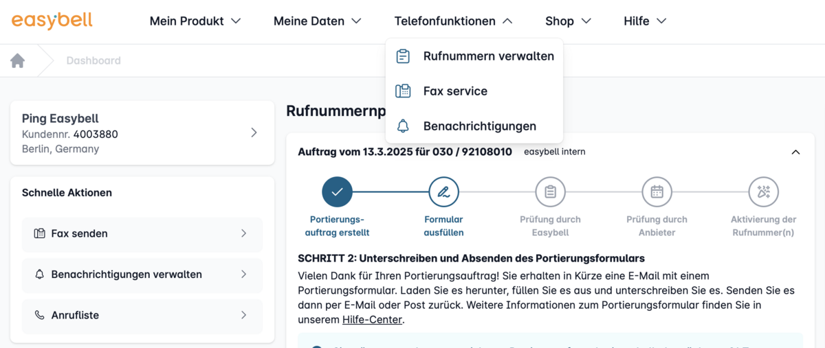 Öffnen Sie das Easybell-Kundenportal. Klicken Sie im oberen Menü auf „Telefonfunktionen“ und wählen „Rufnummern verwalten“.