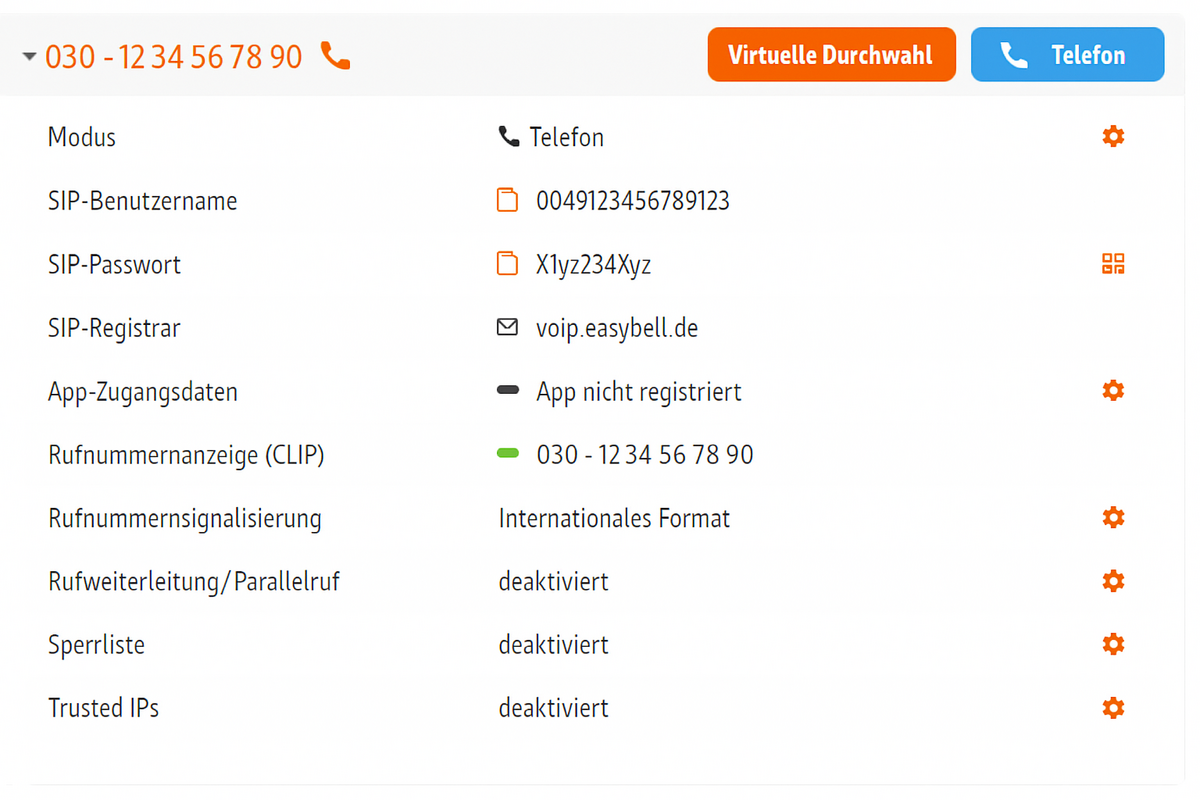 Öffnen Sie durch einen Klick die Einstellungsübersicht Ihrer Rufnummer und gehen auf das Zahnrad neben Trusted IPs.