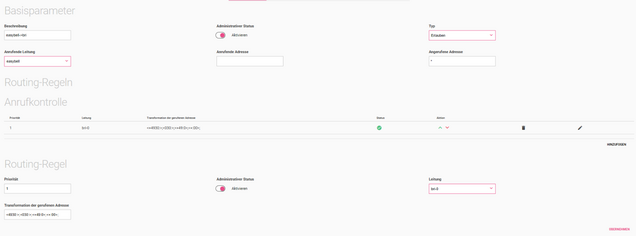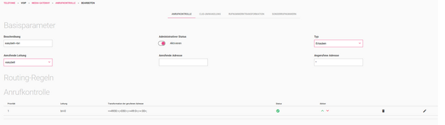 Als nächstes navigieren Sie zu VoIP > Media Gateway > Anrufkontrolle > Routing-Regeln und wählen dort den Eintrag mit der easybell-Leitung zum Bearbeiten aus.