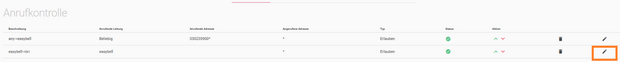 Rufen Sie bitte das Easybell-Kundenportal auf und gehen Sie zu „Telefonfunktionen“ → „Rufnummern verwalten“. Klappen Sie dann bitte die Einstellungen des verwendeten Trunks aus und klicken Sie neben „Rufnummernanzeige (CLIP)“ auf das Zahnradsymbol.