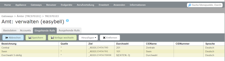 Über das Menü „Gateways“ und den Punkt „Ämter“ gelangen Sie zu einer Übersicht. Wählen Sie dort das zuvor angelegte Amt und klicken Sie dann auf „Bearbeiten“ und anschließend auf „Eingehende Anrufe“.