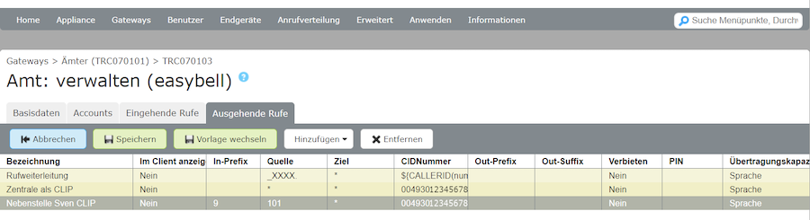 Anschließend klicken auf „Ausgehende Rufe“ und entfernen bei allen bereits vorhandenen Einträgen die Null im „In-Prefix“.