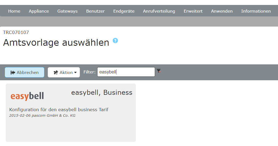 3. Wählen Sie aus der Liste den Provider „easybell“. Über die Filterfunktion können Sie die Auswahl der Amtsvorlagen einschränken.