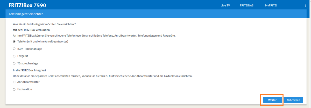 3. Wählen Sie nun, welche Art von Telefoniegerät Sie einrichten möchten. Haben Sie sich entschieden, klicken Sie bitte auf „Weiter“.