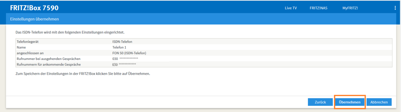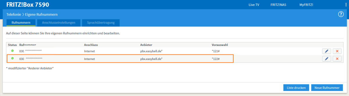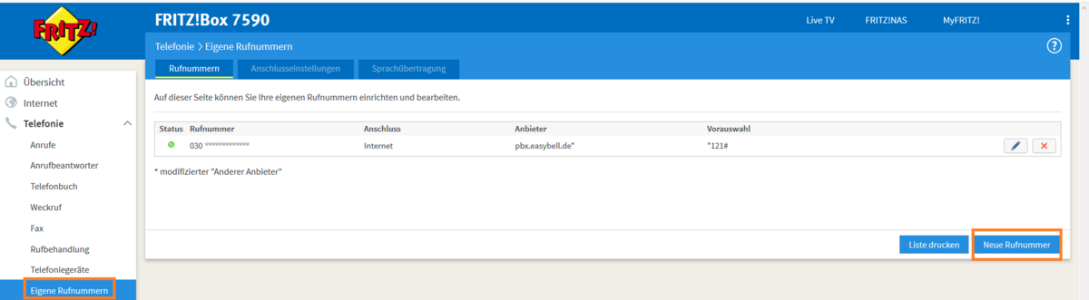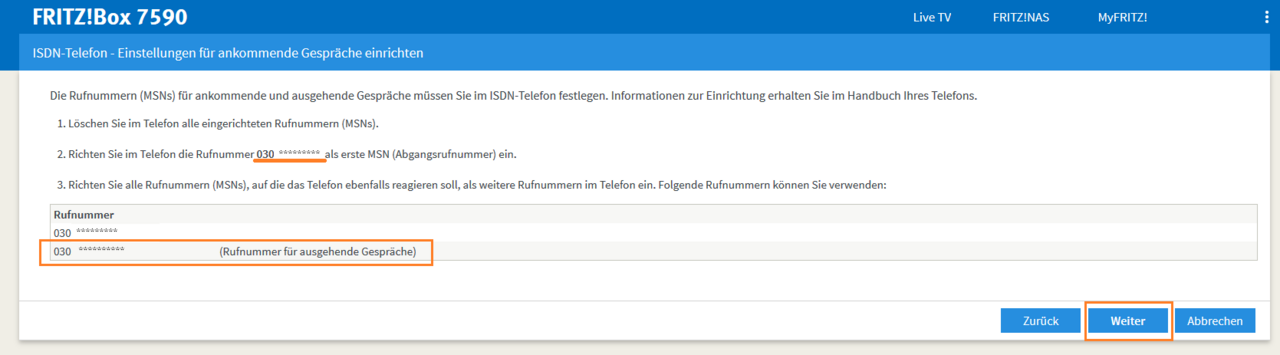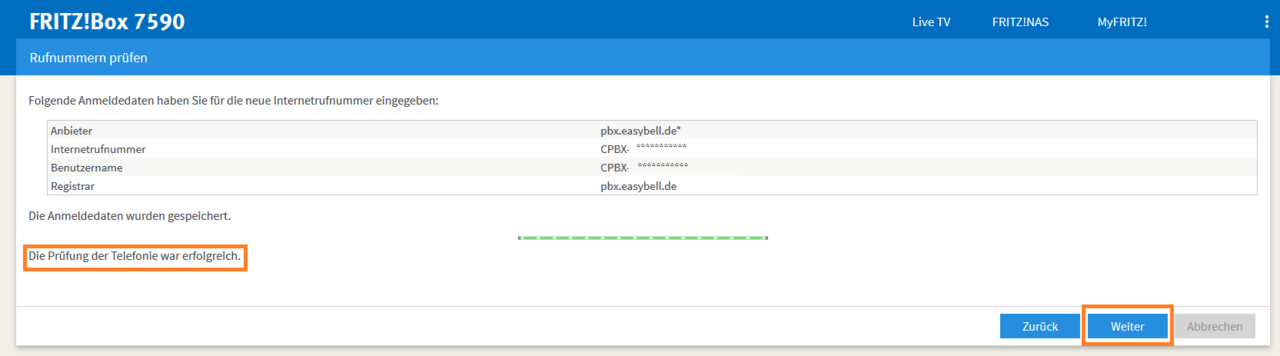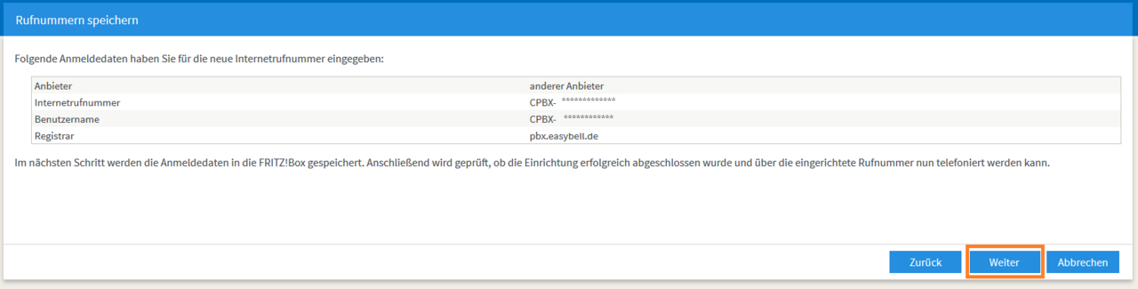 10. Klicken Sie erneut auf „Weiter“. Sie sehen nun, dass die Rufnummer des registrierten Endgeräts in Ihrer Rufnummernliste in der FRITZ!Box aufgenommen wurde:
