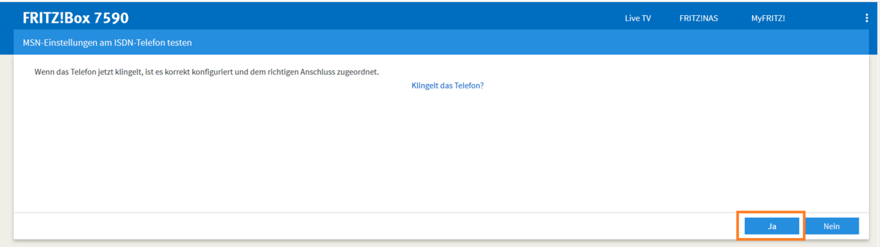 7. Nach einer kurzen Zeit erfolgt der Telefontest Ihrer FRITZ!Box. Wenn das gewünschte Telefoniegerät klingelt, klicken Sie bitte auf „Ja“: